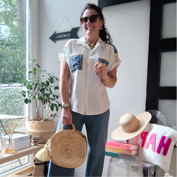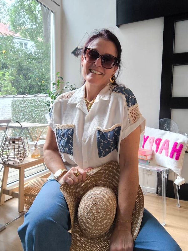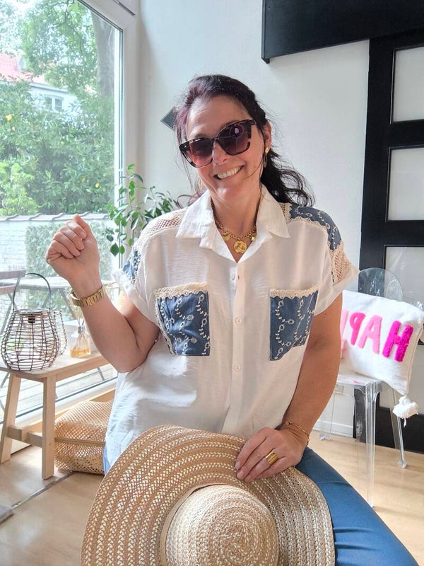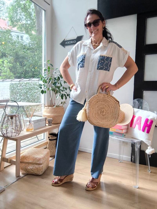 Chemise avec poches poitrine en jeans brodé, et broderie et jeans sur le dessus des épaules.