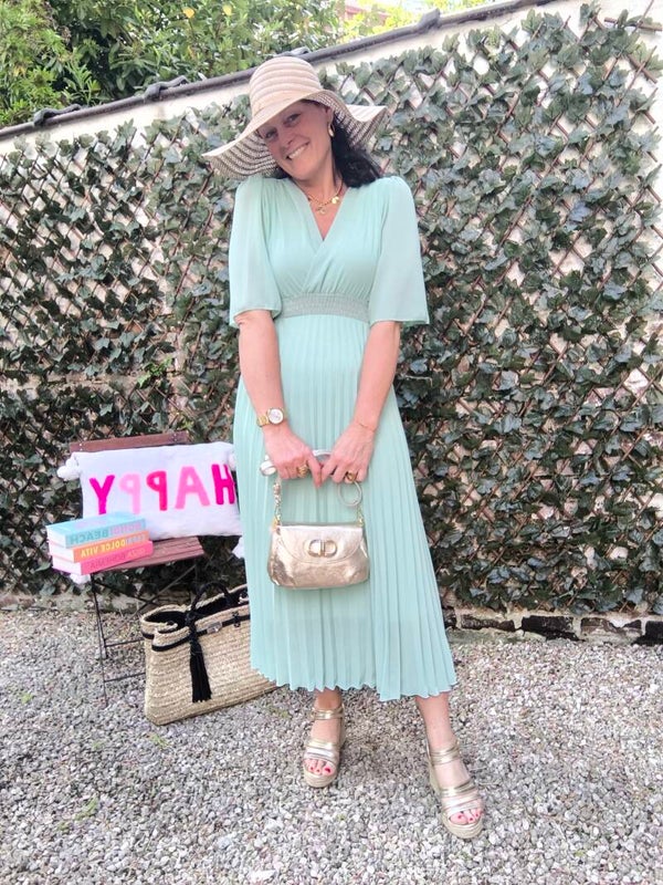 Robe longue plissée cache-cœur resserrée à la taille par un smoke , manches larges jusqu'au coude.