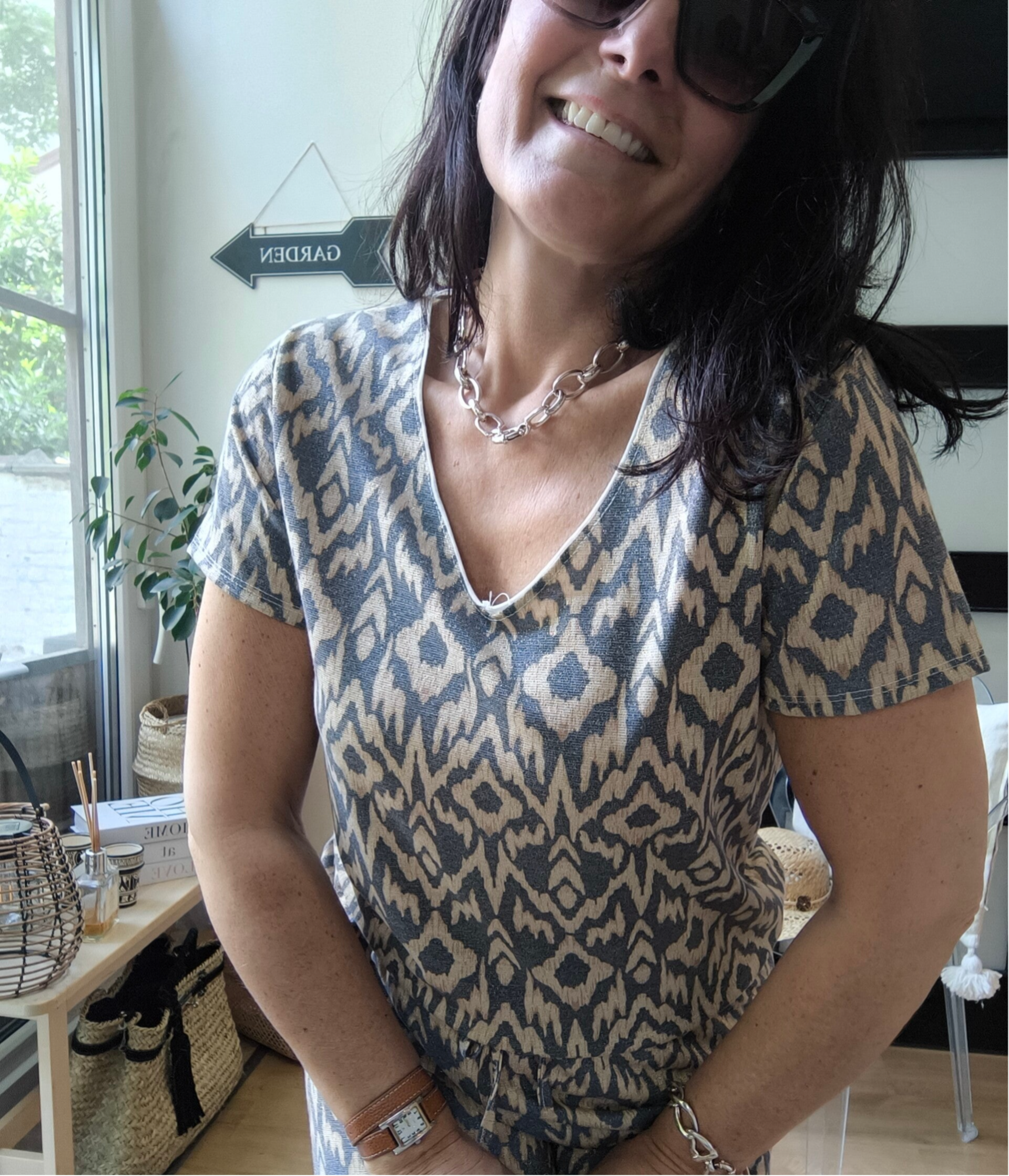 T-shirt col V imprimé dans les tons de beige, doré et bleu jeans.