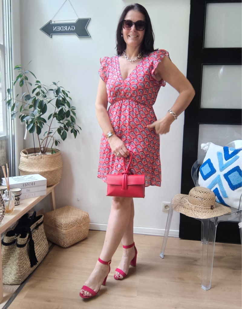 Robe imprimée, légèrement cache-coeur, décolleté et dos en V avec liens à nouer dans le cou. Élastique à la taille. Épaules volantées. Doublée.