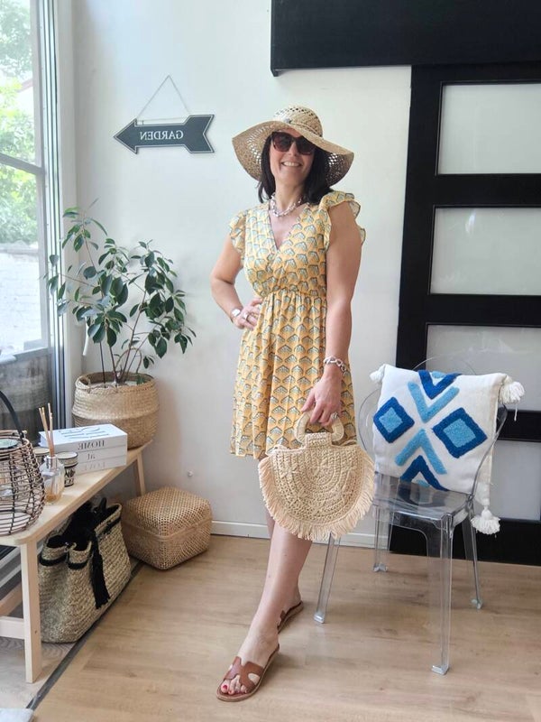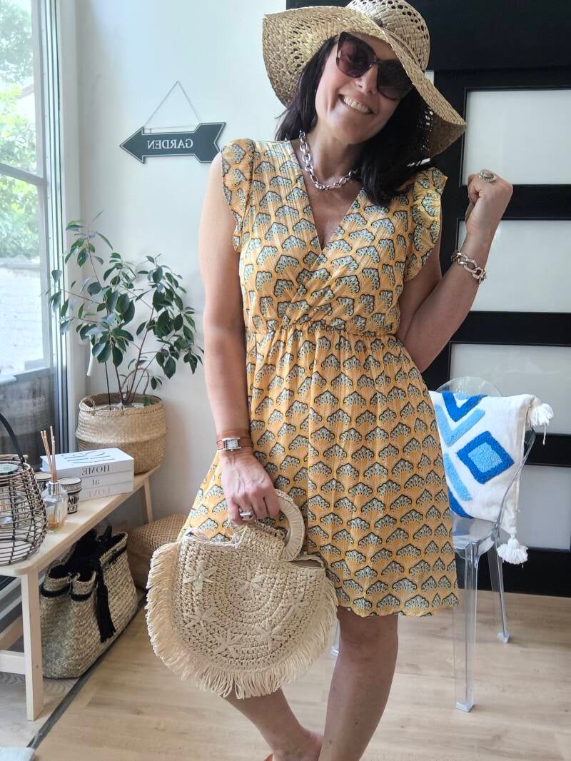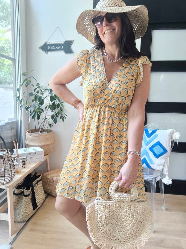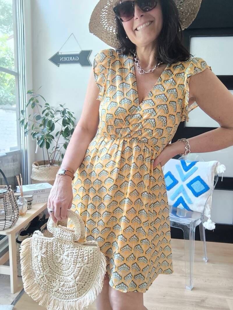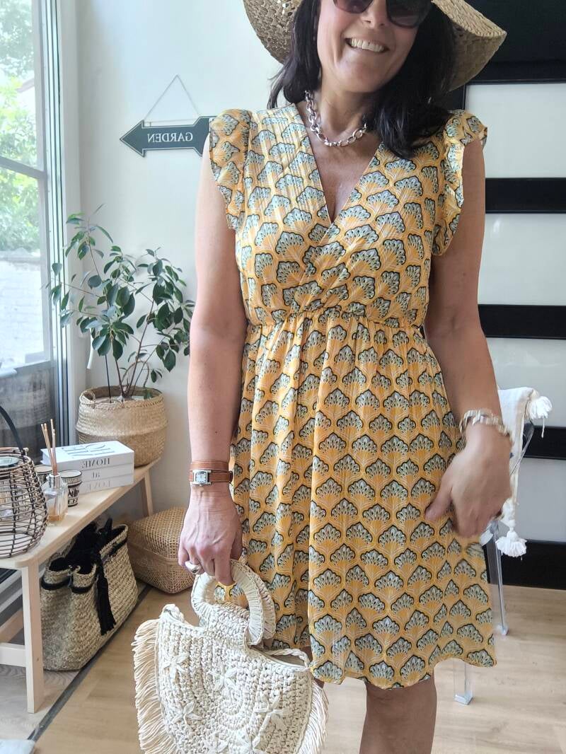 Robe imprimée, légèrement cache-coeur, décolleté et dos en V avec liens à nouer dans le cou. Élastique à la taille. Épaules volantées. Doublée.