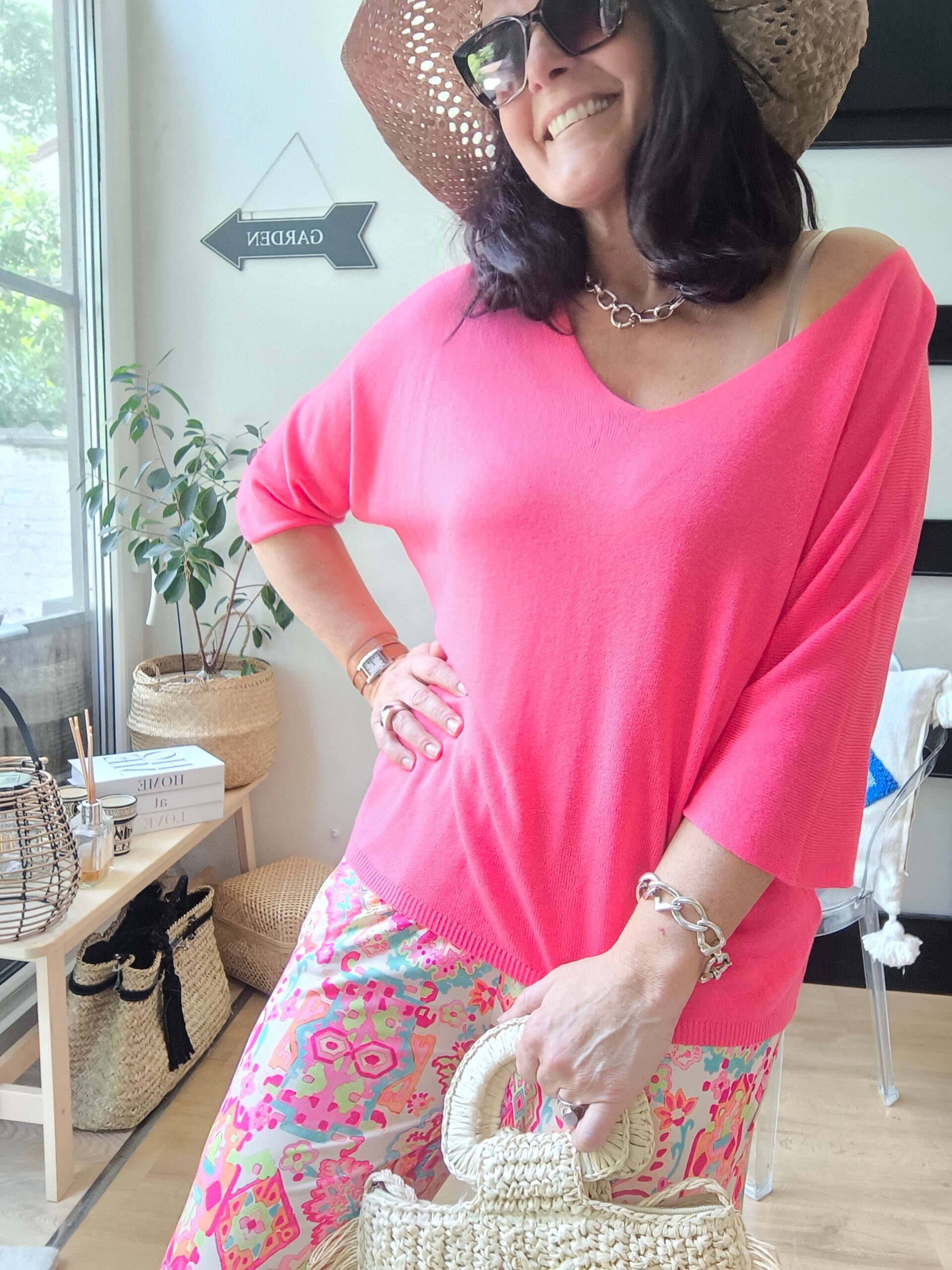 Pull chauve-souris fin col V manches mi-longues.