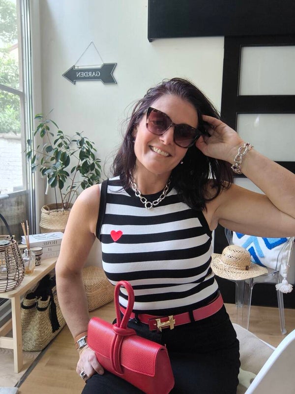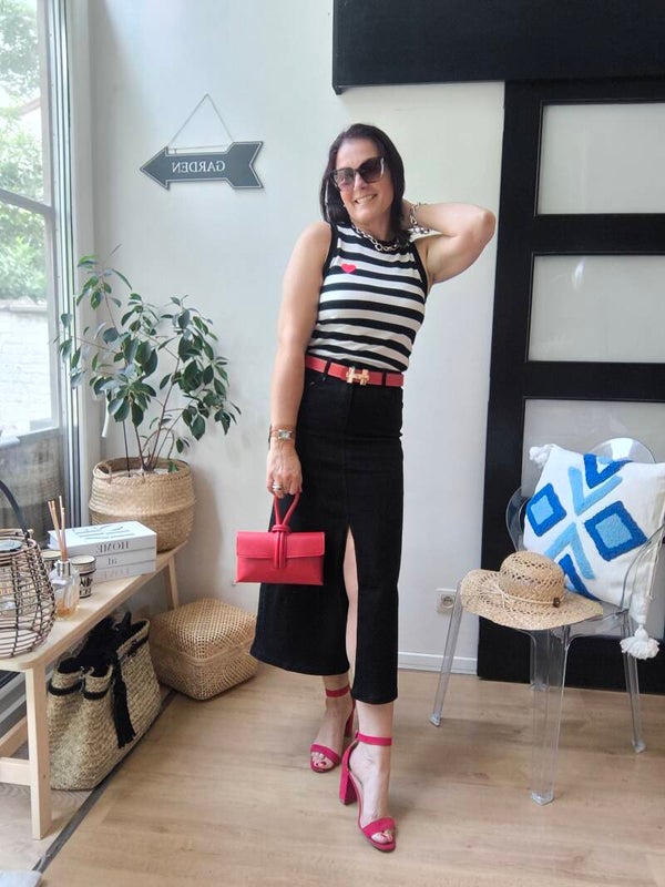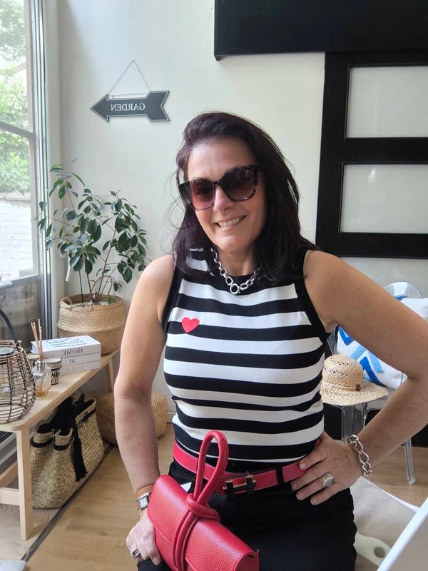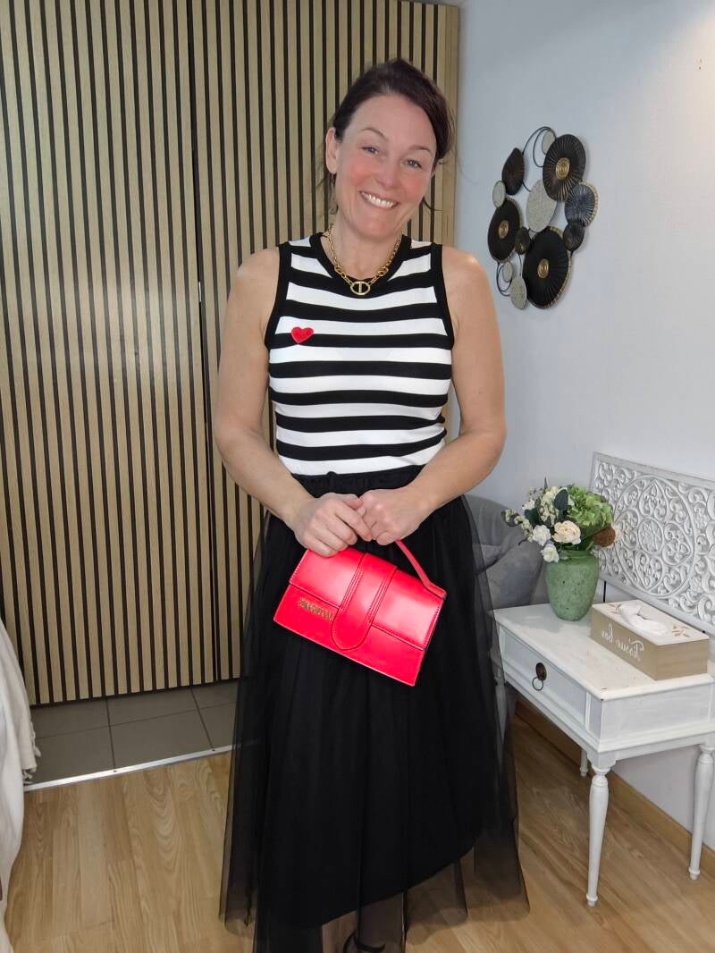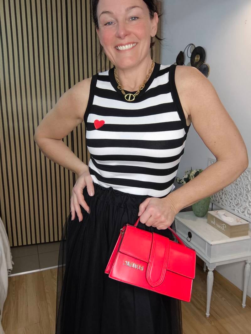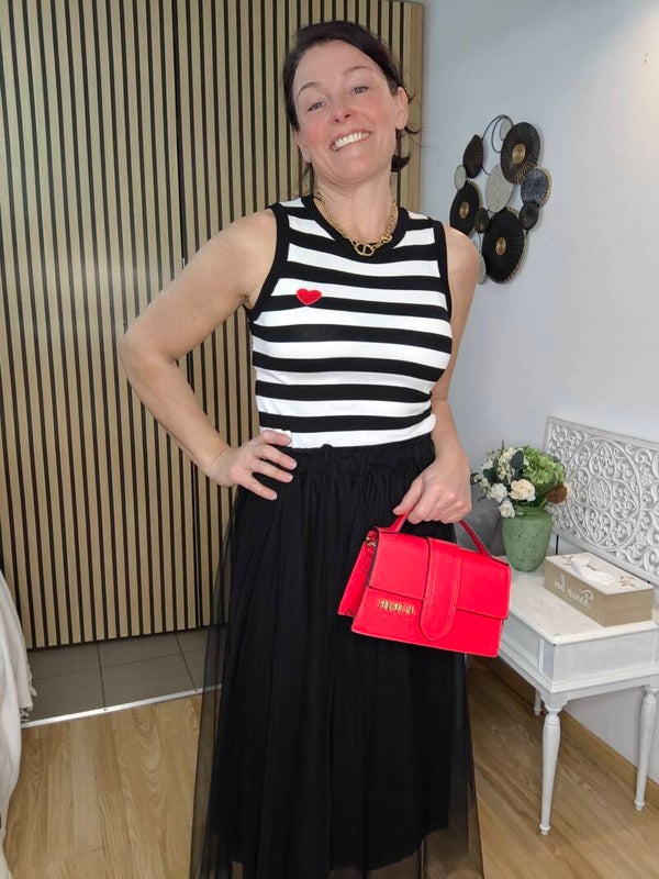 T-shirt rayer noir et blanc avec broderie cœur rouge.