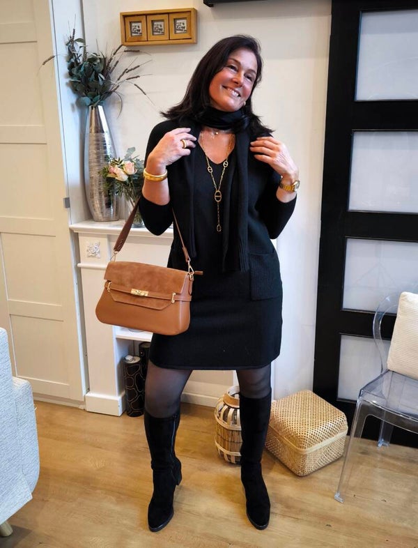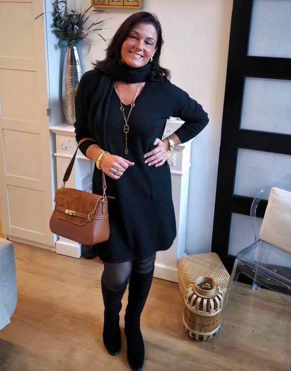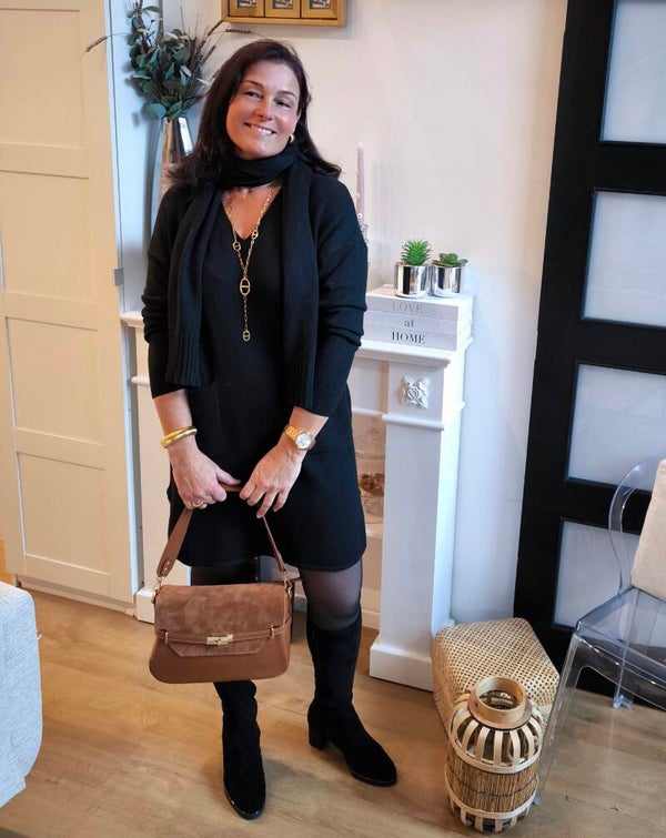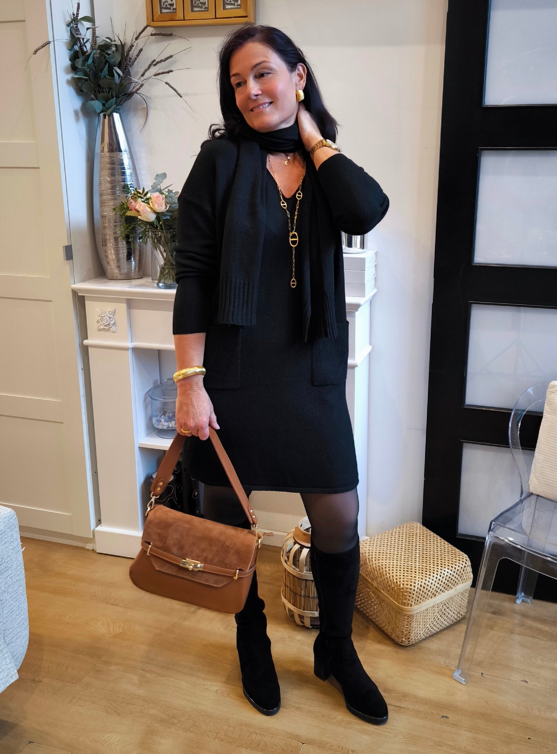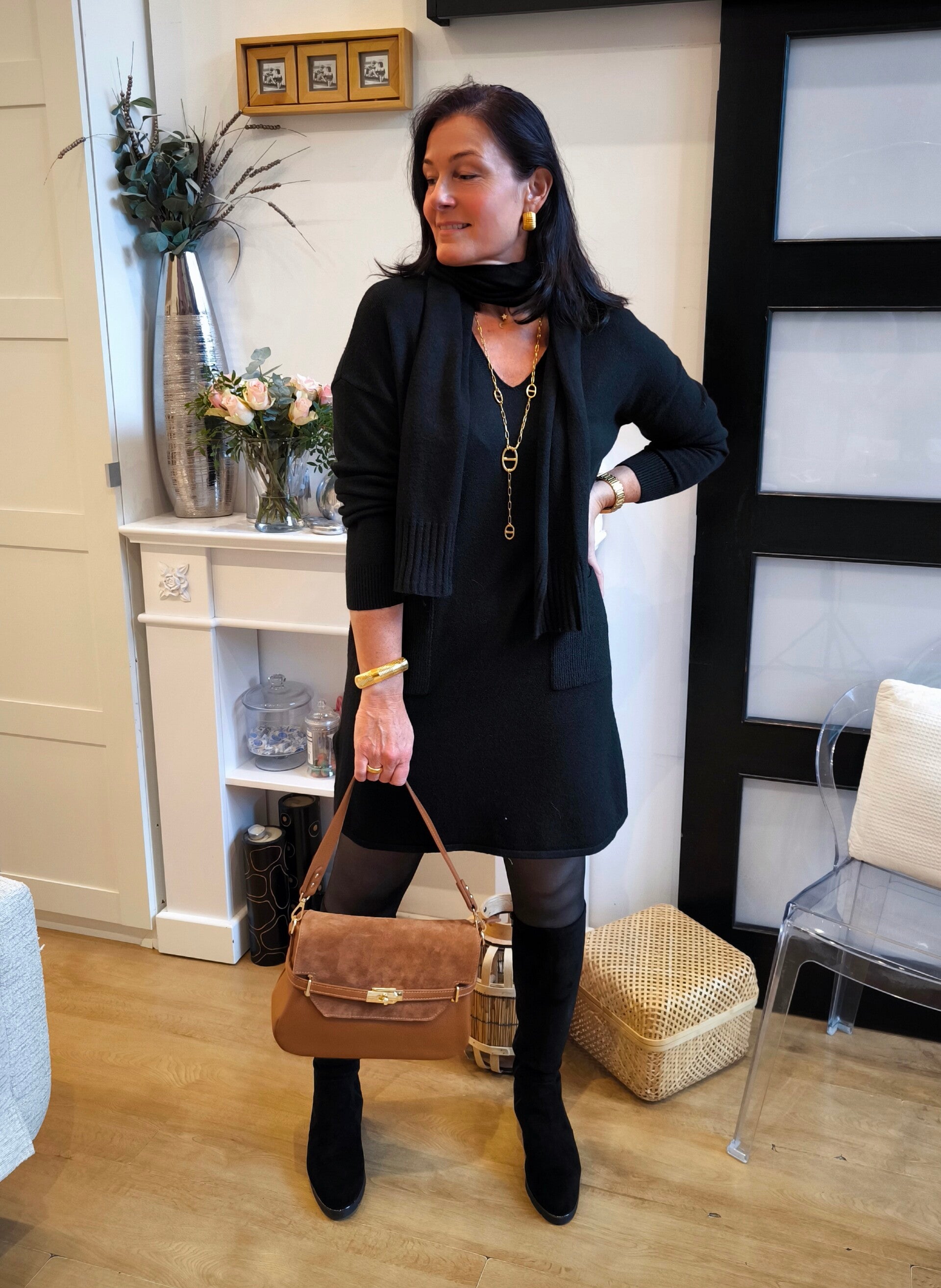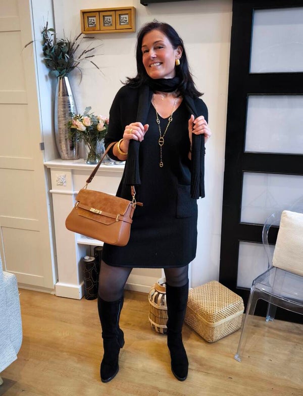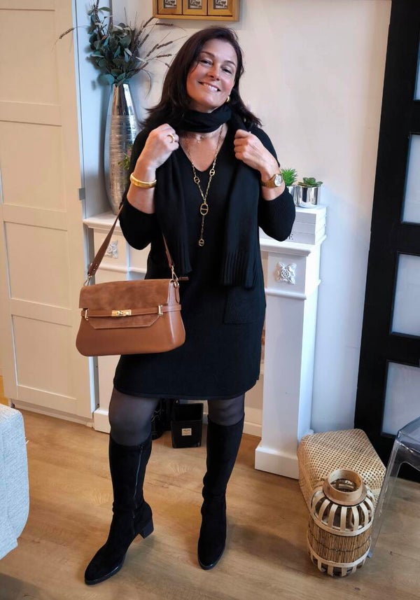 Robe pull extensible col V avec écharpe et 2 poches plates avant.
