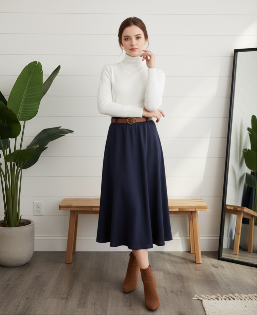 Longue jupe fluide évasée avec ceinture en simili cuir , élastique à l'arrière de la taille.
