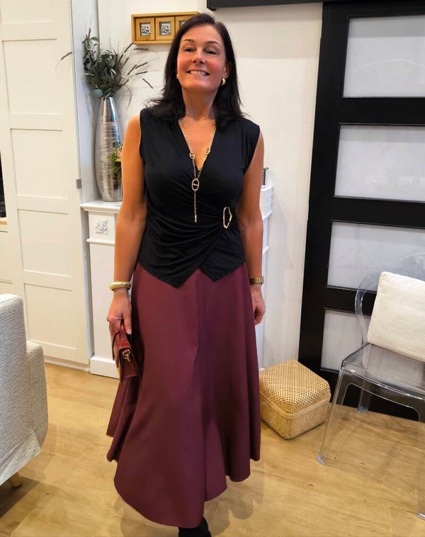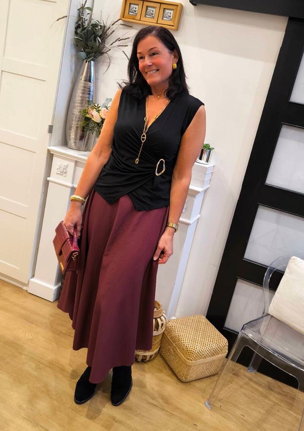 Longue jupe fluide évasée avec ceinture en simili cuir , élastique à l'arrière de la taille.