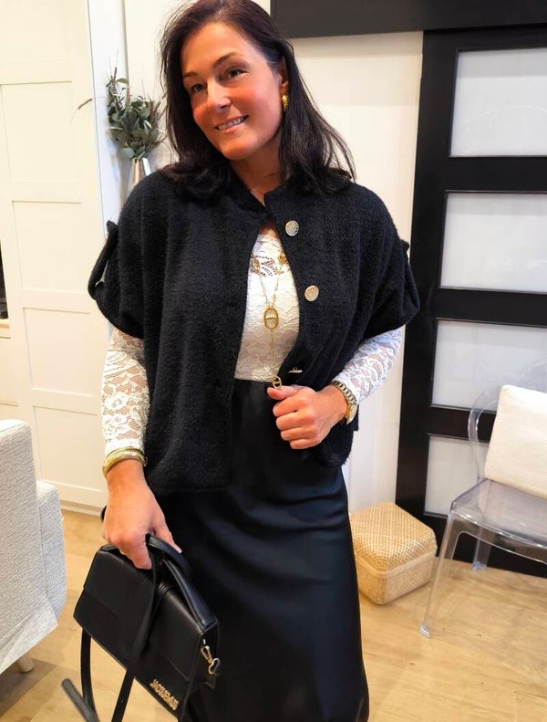 Gilet veste/cape en matière pull, manches courtes légèrement chauve-souris, boutons dorés