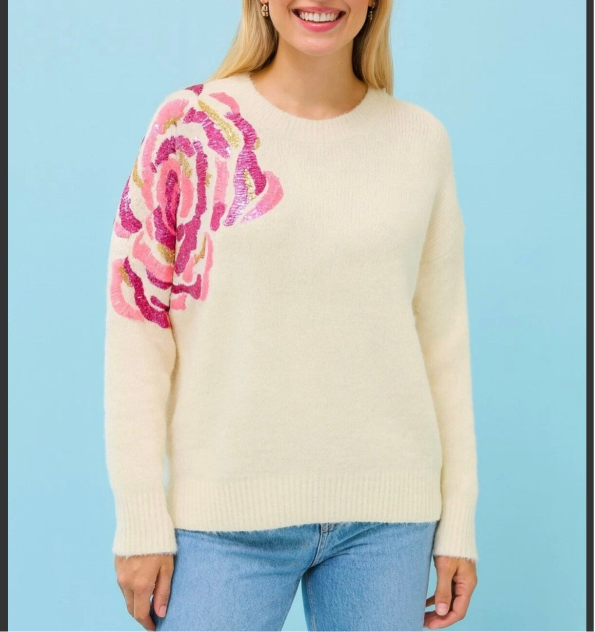 Pull douillet ample avec broderie fleur en sequins sur l'épaule.