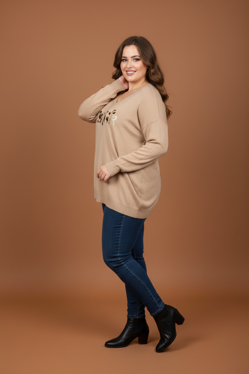 pull fin aspect molletonné intérieur, imprimé AMOUR en léopard fausse fourrure.