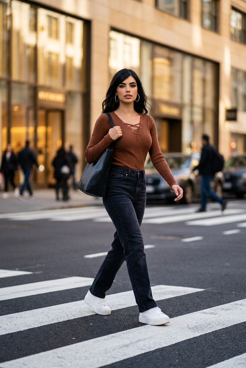 Pull fin côtelé avec lacets décolleté