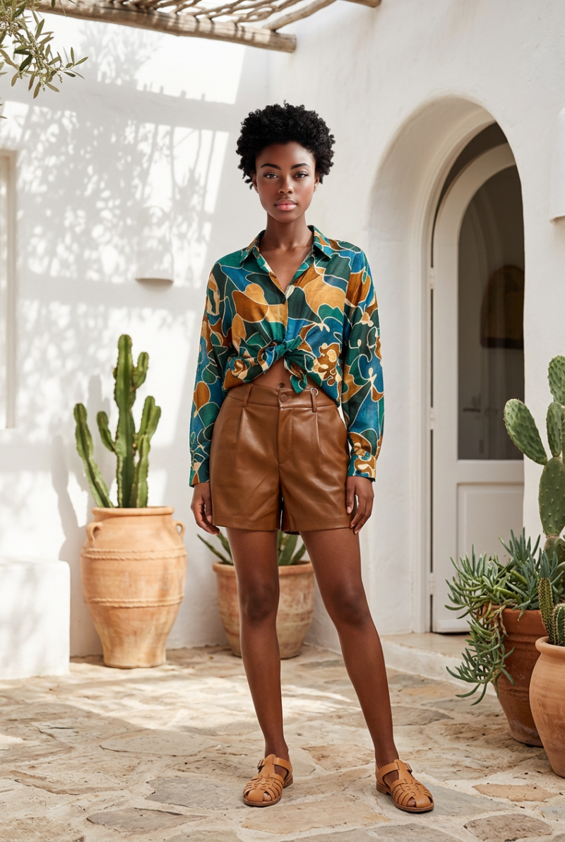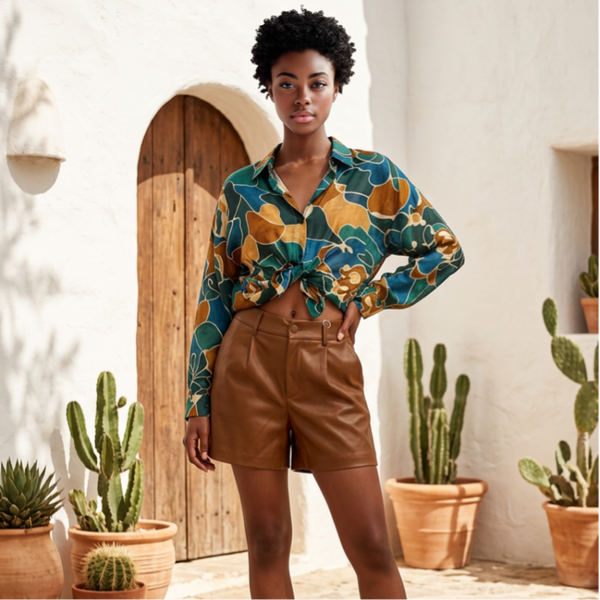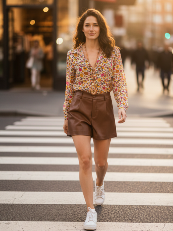 Short évasé en simili cuir, bouton et tirette, poches côtés.