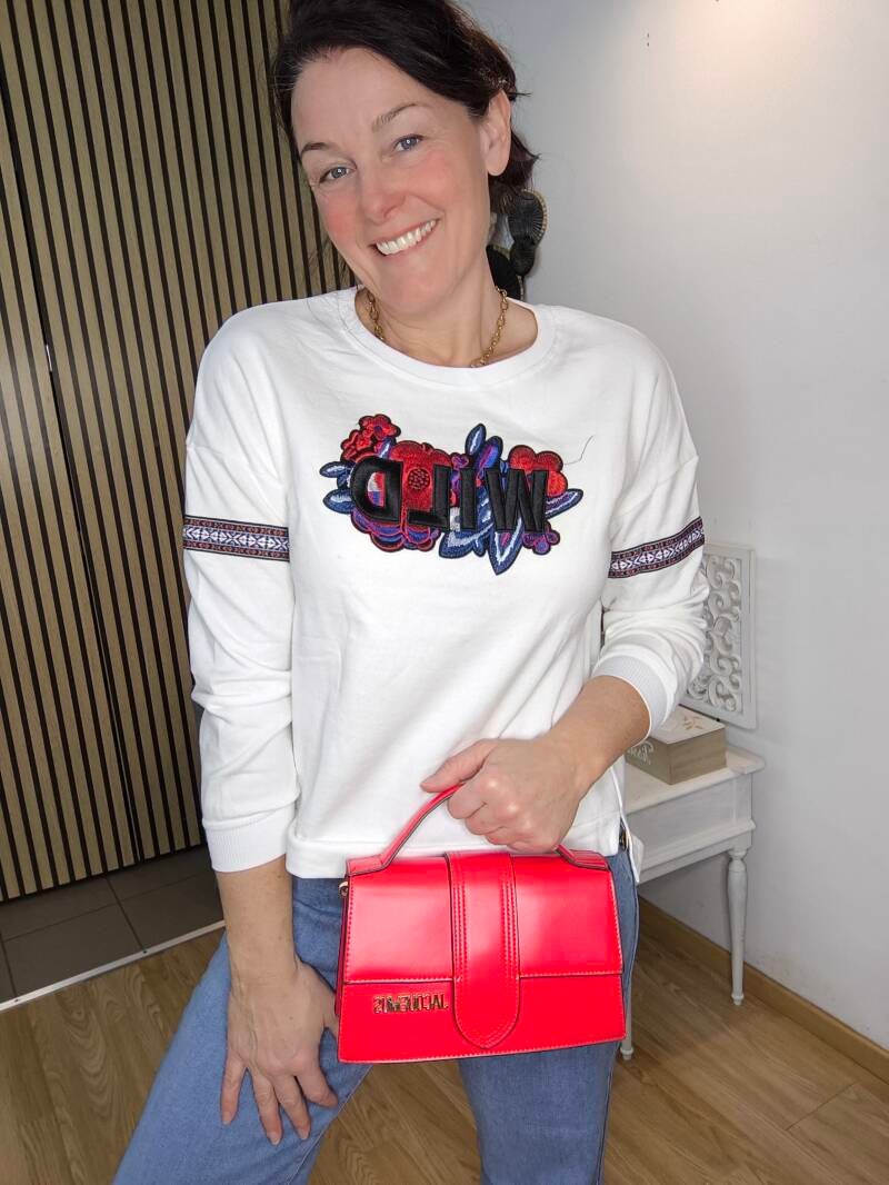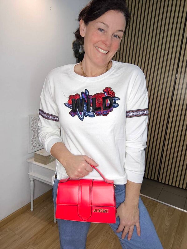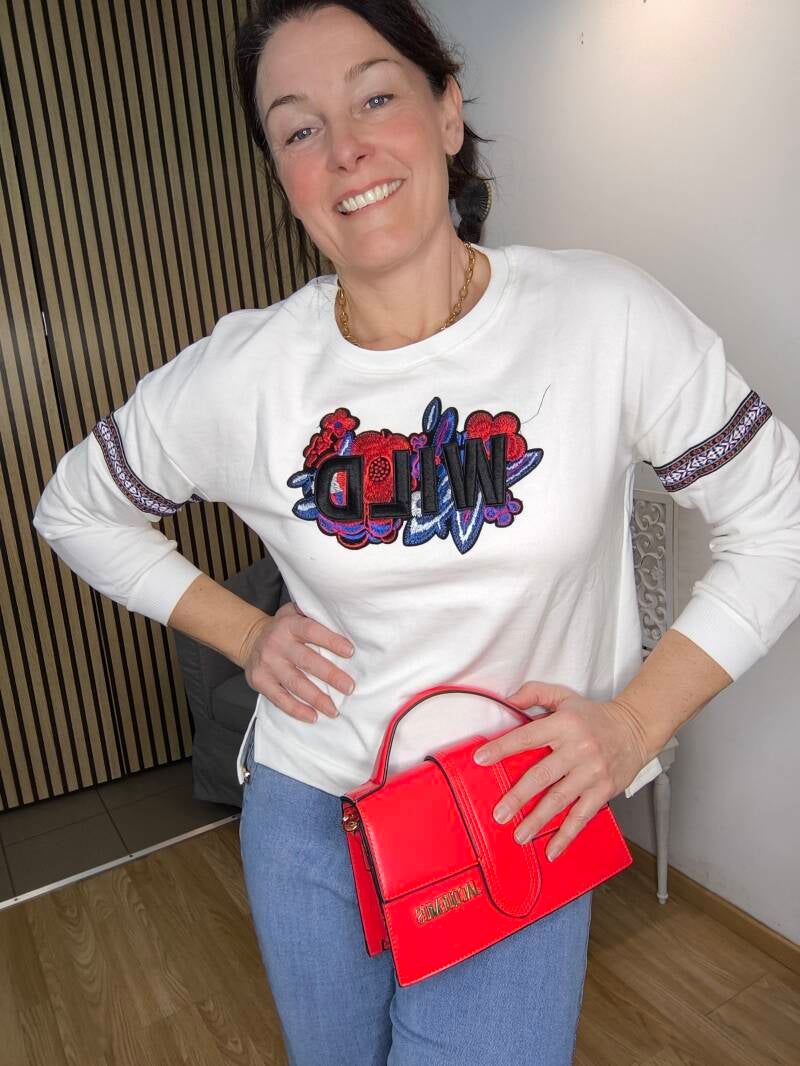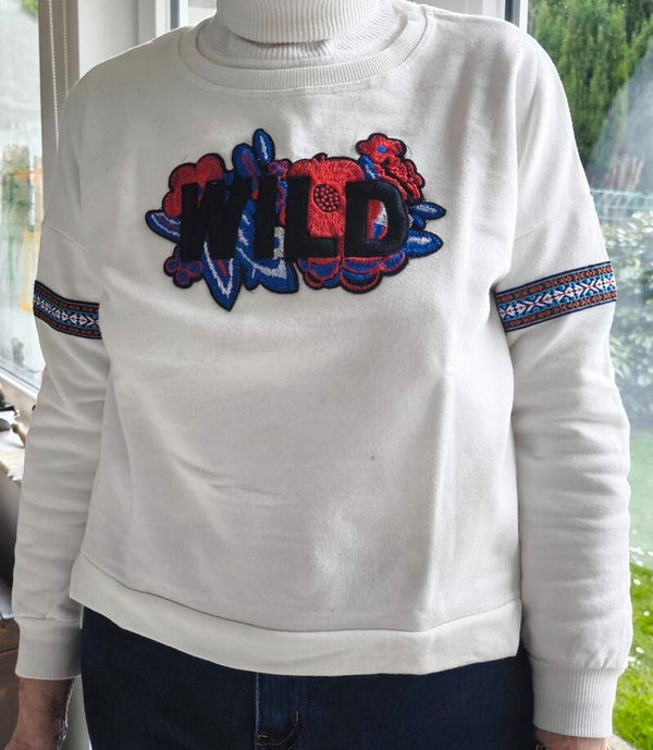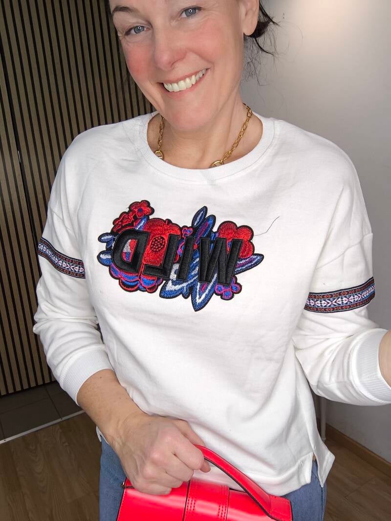 Sweat fin brodé "WILD" et fleurs, bande brodée aux manches. Découpe aux hanches et plus long derrière.