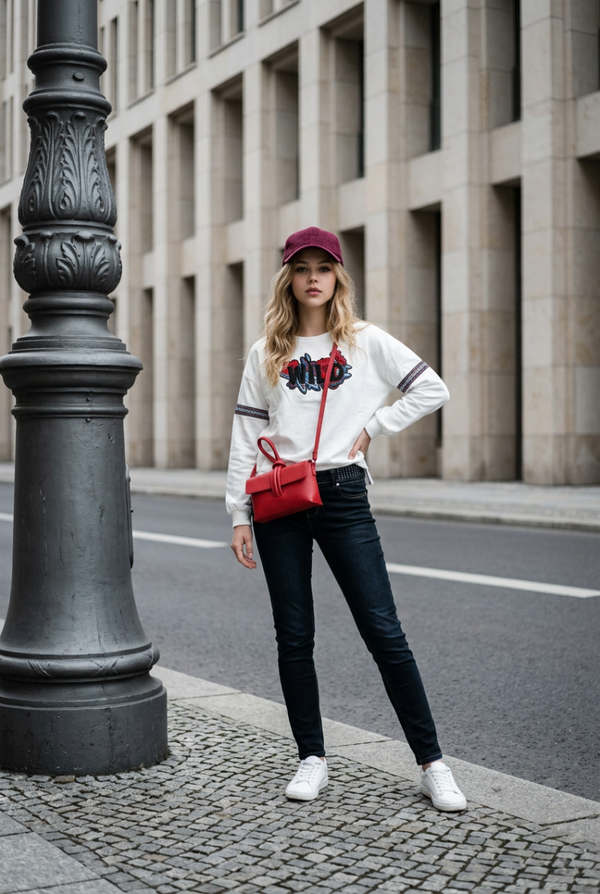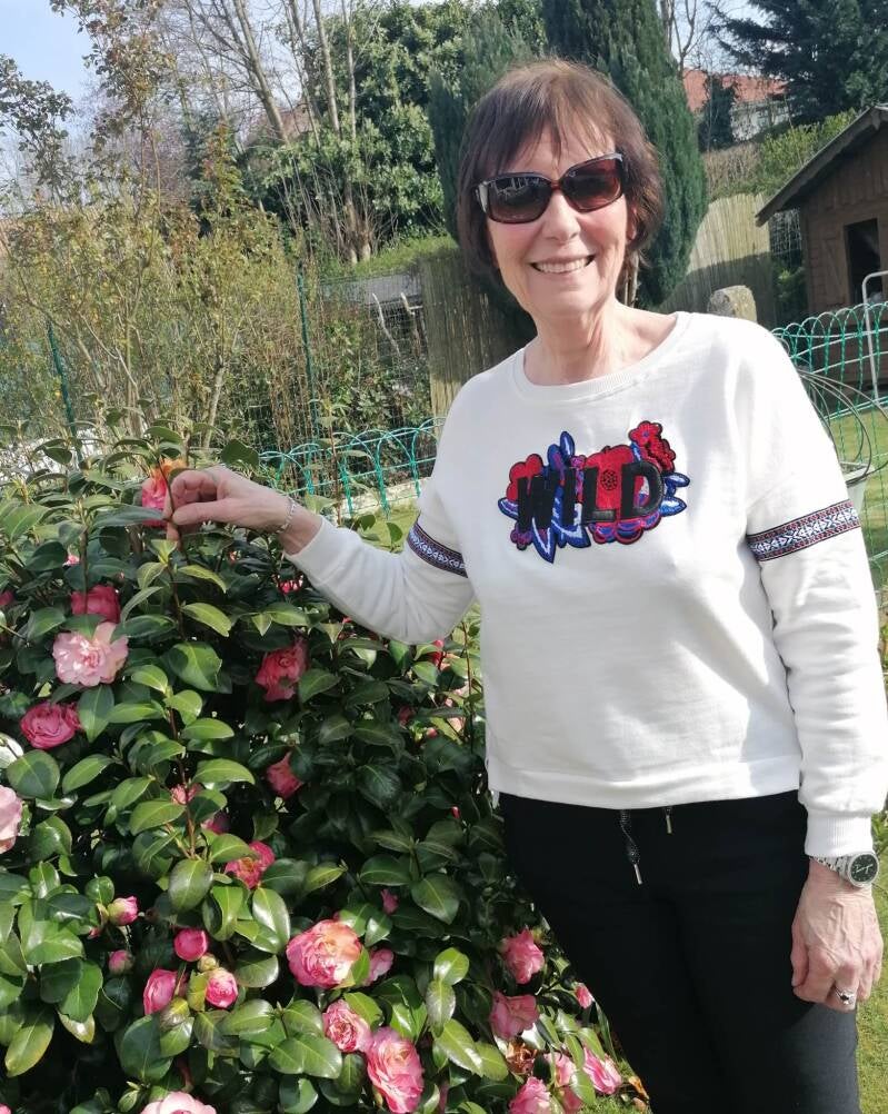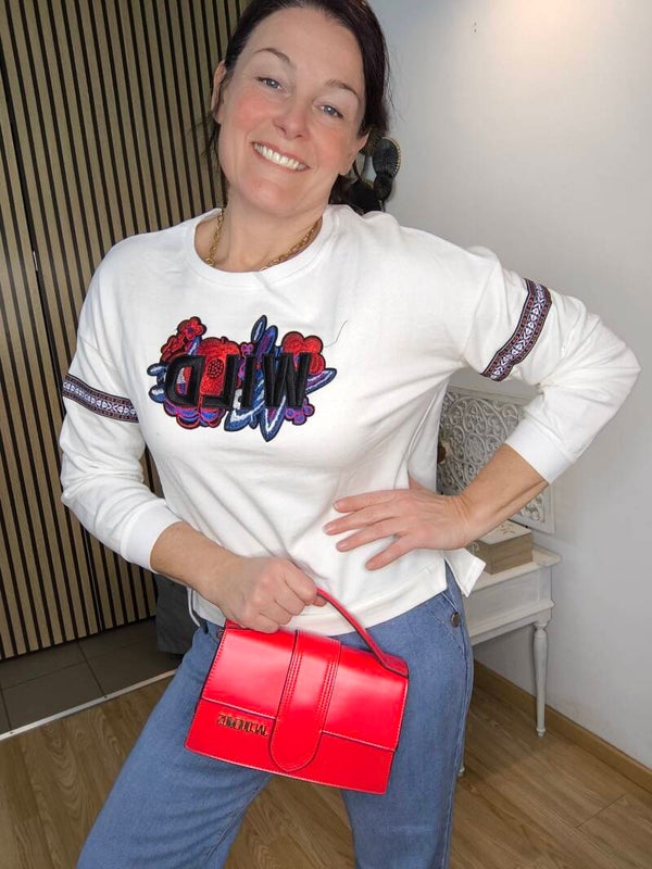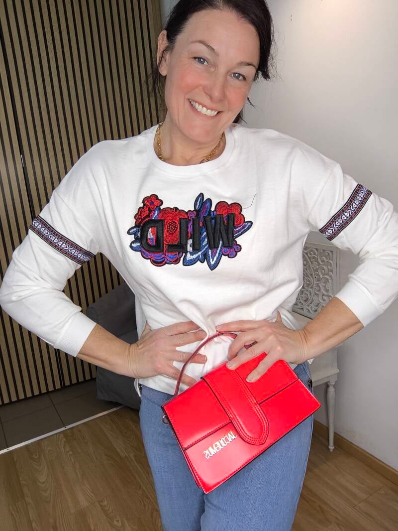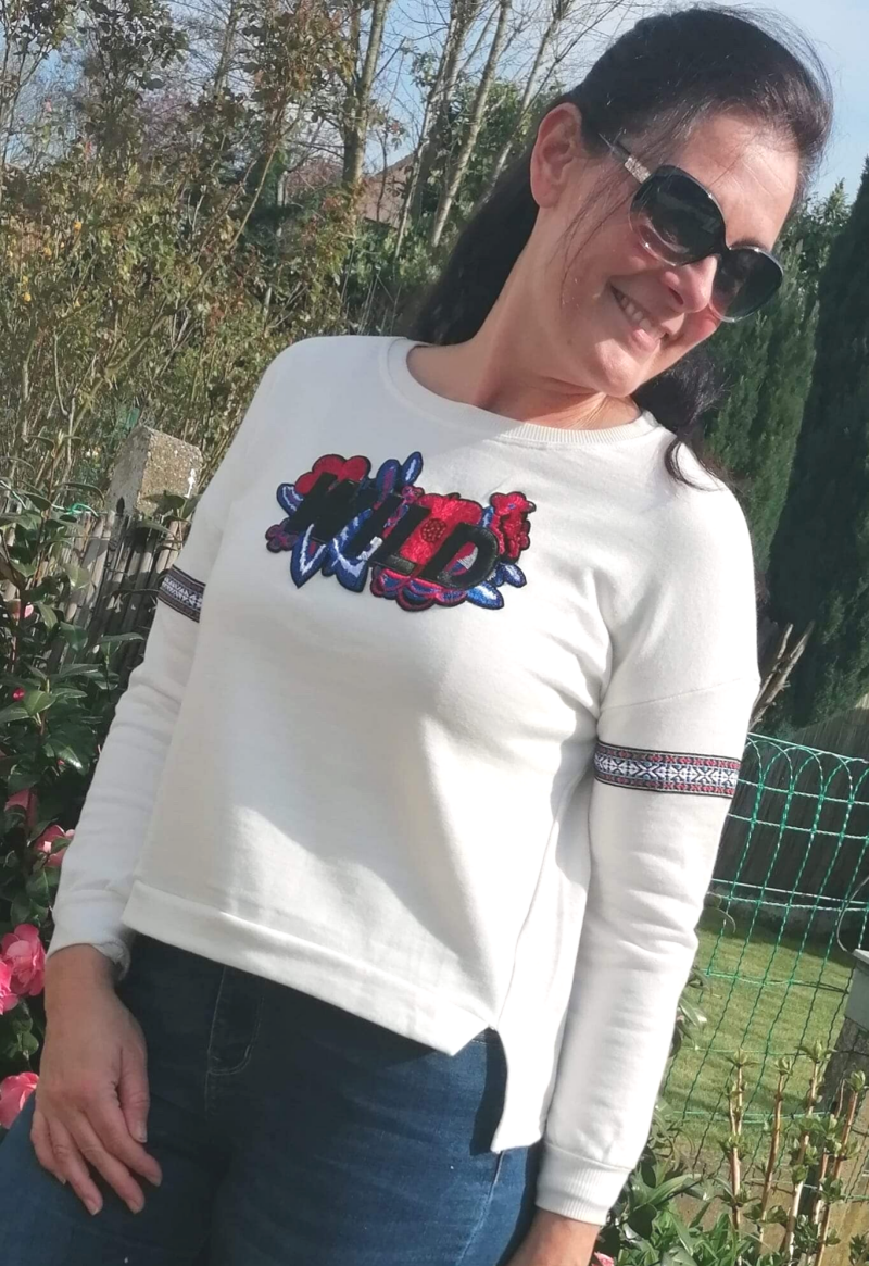 Sweat fin brodé "WILD" et fleurs, bande brodée aux manches. Découpe aux hanches et plus long derrière.